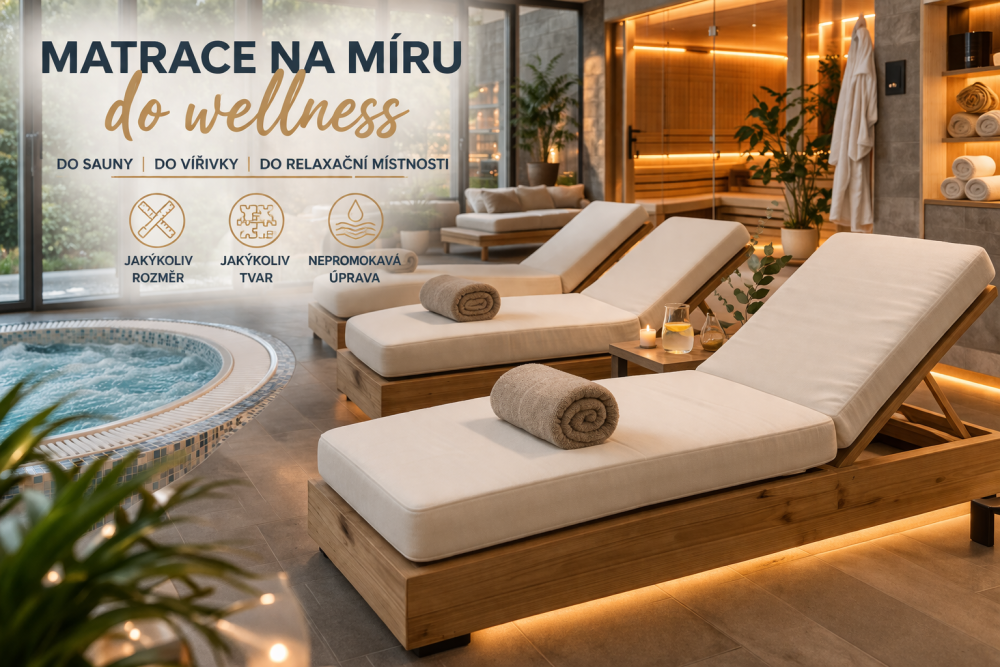Hledáte kvalitní matrace na míru do wellness, které budou přesně odpovídat Vašemu prostoru, požadavkům na pohodlí i nárokům na provoz? Nabízíme zakázkové matrace pro soukromé i komerční využití, a to v libovolném rozměru i tvaru. Dodáme Vám řešení přesně podle zadání – pro relaxační zónu, lehátko, odpočívárnu, saunový prostor i další wellness využití.